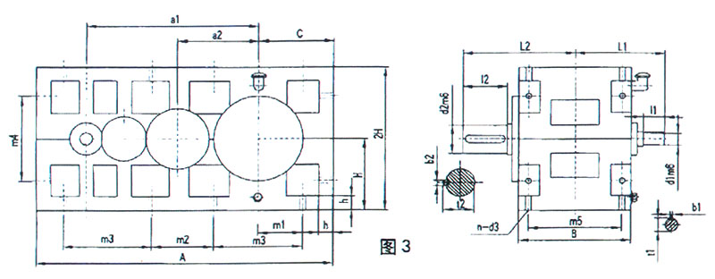 齒輪箱的外形、組合型式見圖3、圖4,規(guī)格尺寸見表6。